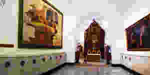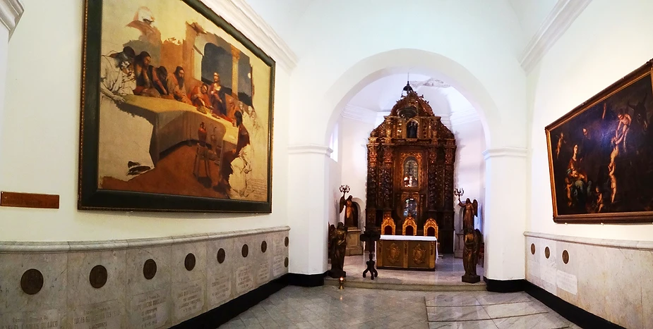Al fondo de la misma resalta un hermoso retablo de estilo barroco, como pocos en Venezuela. Una lámpara de plata del tiempo colonial cuelga del arco principal de la capilla y lleva una inscripción: “Soy de la Capilla de Nuestra Señora del Pilar de la Catedral de Caracas”. También se exhibe una pintura colonial intitulada “Un descanso en la huida de Egipto” de la Escuela de Murillo. Pero frente a ella hallamos una obra prima, un lienzo inacabado: “La última cena” de Arturo Michelena. La muerte lo sorprendió cuando estaba casi terminado el cuadro una mañana del 29 de julio de 1898; fallecía a los 35 años de edad. Destaca Juan Calzadilla que es una de las composiciones más equilibradas y arquitectónicas de Michelena. Encontramos detalles realzados en primeros planos, con la misma importancia de las figuras de los apóstoles, como el ánfora sobre el asiento, junto al Judas de expresión conflictiva. Es una obra, aunque inconclusa, digna de admirar. Es el testamento de Michelena.